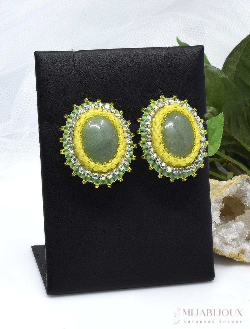 Elegantním řešením, když si chcete ozdobit uši náušnicemi, ale nemáte propíchnuté ušní lalůčky, jsou náušnice s klipsovým zapínáním. Autorské klipsové náušnice jsou zhotoveny z kabošonů zeleného avanturínu, které jsou obšité štrasovým prýmkem a skleněným japonským rokajlem Toho Round ve zeleném a žlutém provedení.