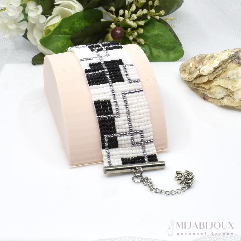 Tento masivní tkaný náramek z japonských drobných korálků Toho v barvách bílé, černé a zlaté doporučujeme těm, kteří hledají jedinečný a luxusní doplněk, jež vyčnívá svým designem a kvalitou. Vytváří pro jeho nositele pocit luxusu a výraznosti.