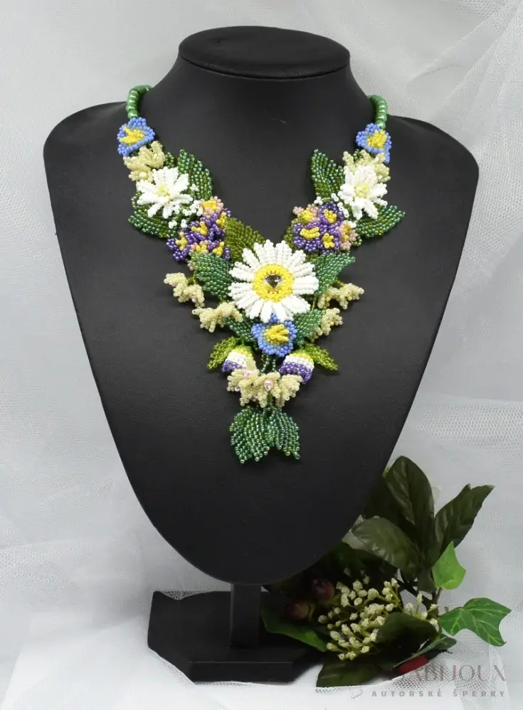 Ručně šitý náhrdelník je inspirovaný krásou kvetoucí louky. Šperk kombinuje různé odstíny korálků zelené barvy s kytičkami v barvě bílé, žluté, modré, fialové a růžové, což vytváří harmonický obraz rozkvetlé louky. Elegantní náhrdelník je ideálním šperkem pro milovníky přírody a originálních doplňků. Prostřednictvím tohoto náhrdelníku si přinesete kousek rozkvetlé přírody do každodenního života.