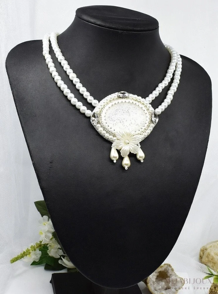 Elegantní náhrdelník se dvěma řadami skleněných perel v klasické bílé barvě. Dominantním prvkem je velký oválný střed s jiskřivým bílým glitrovým kabošonem, obroubený drobnými perlami a stříbrným japonským rokajlem. Celý střed zdobí luxusní krystalové kamínky, velká perlová květina a tři elegantně zavěšené kapkovité perly.