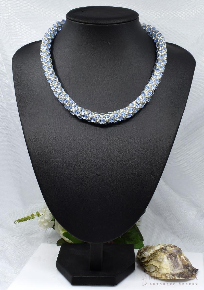 Představujeme ručně šitý světle modrý náhrdelník. Tento výjimečný kousek je vytvořen technikou šití z korálků.